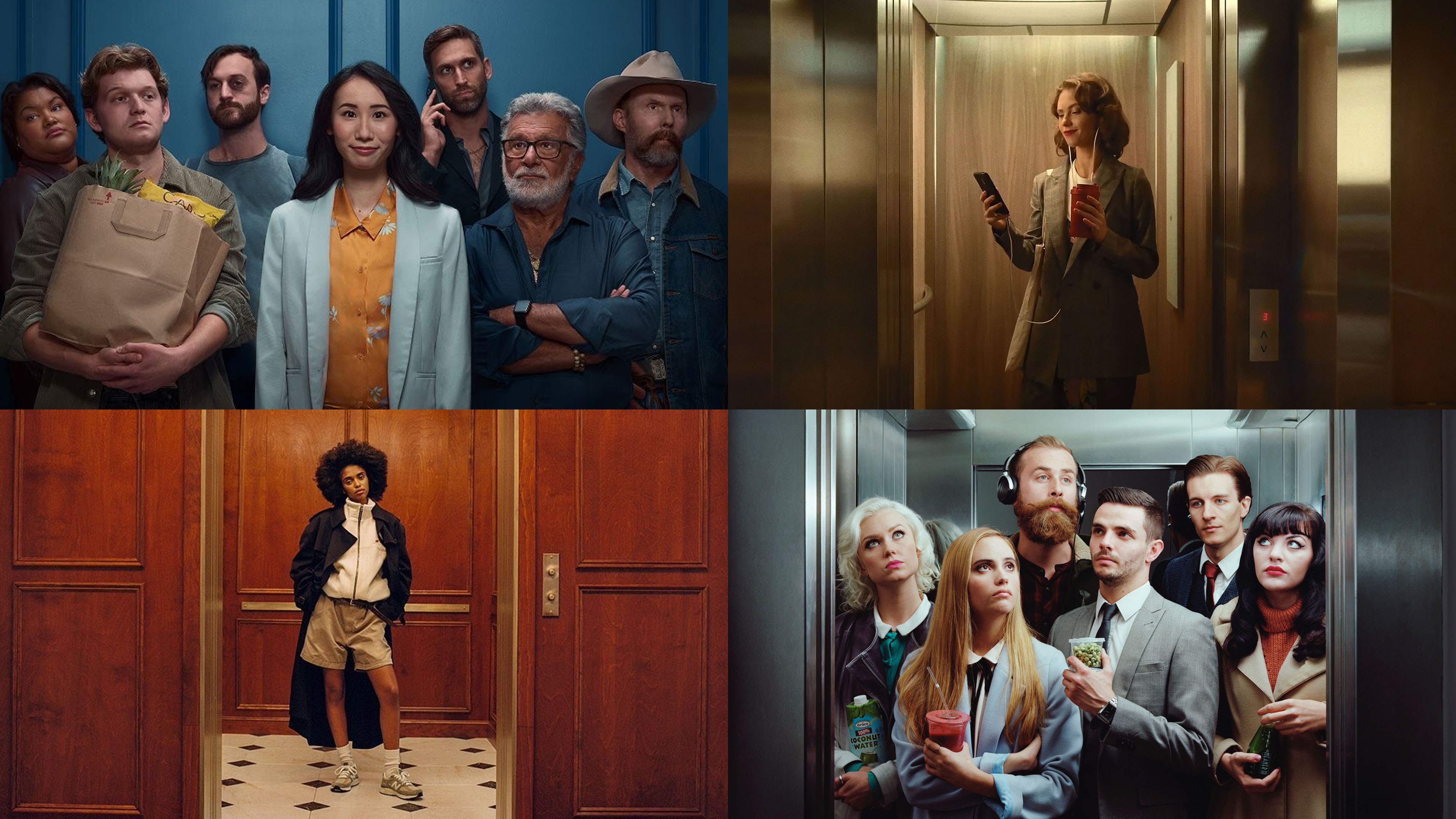 We fotograferen losse mensen altijd in een lift, als abstract kader voor een moment tussen vertrek en aankomst. Dit levert krachtige beelden op waarin compositie en persoonlijkheid samenkomen.