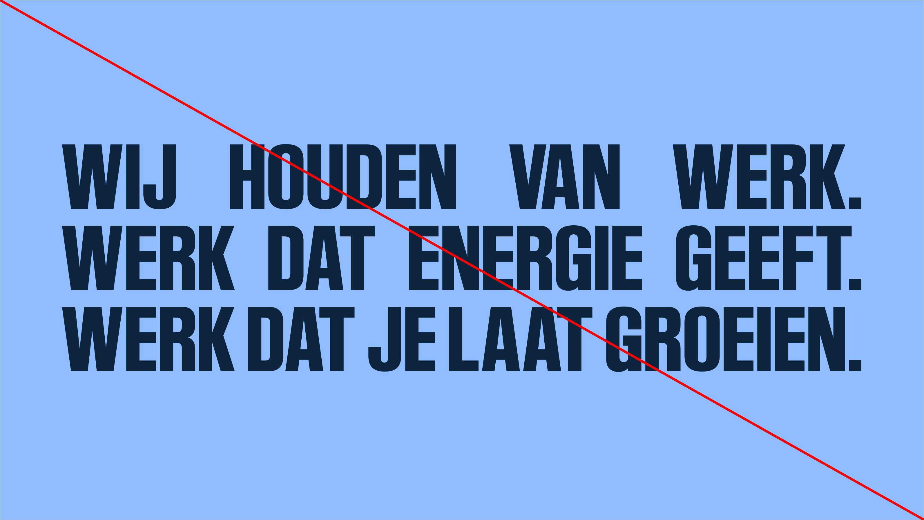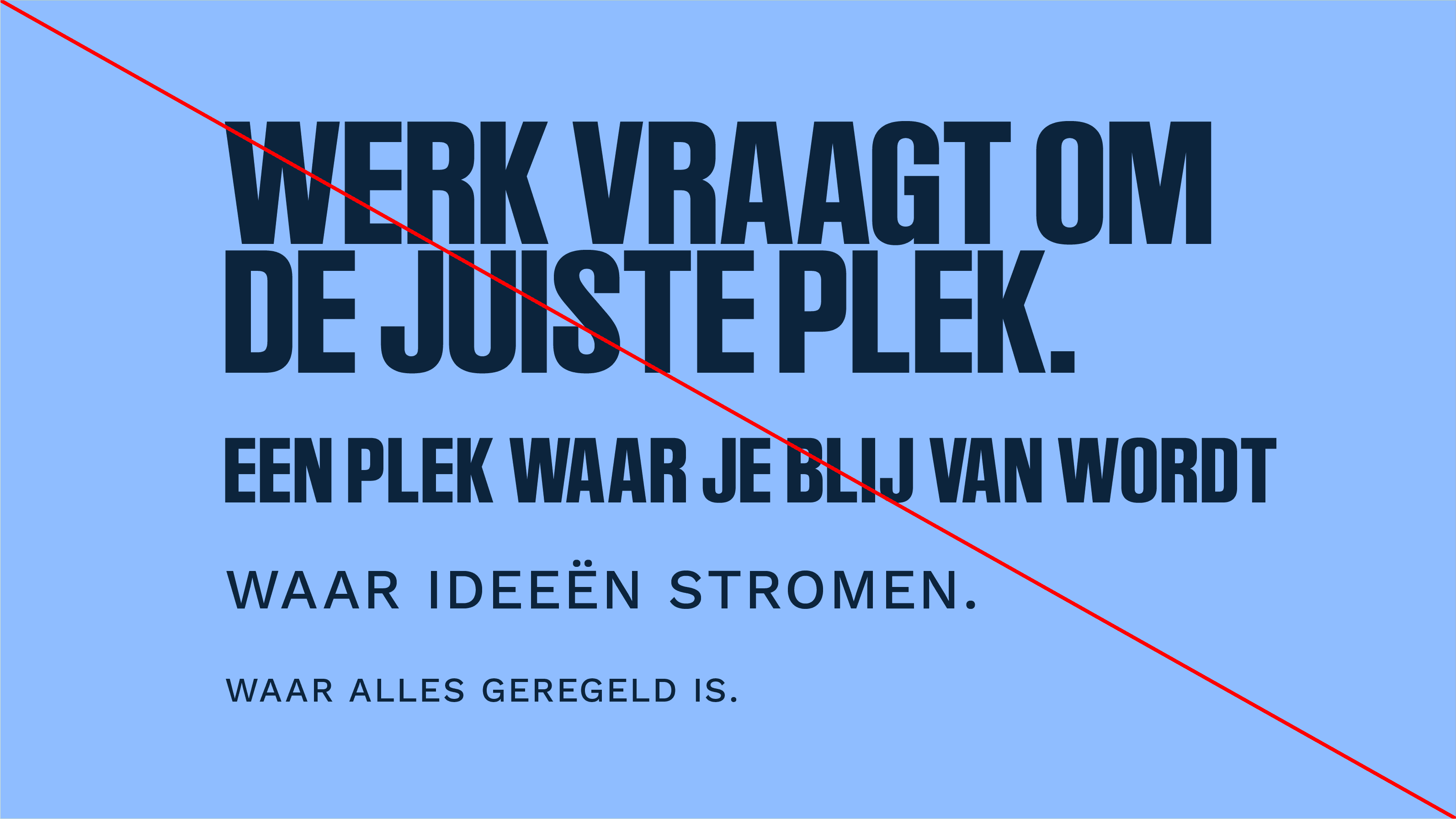 Er is een duidelijke typografische hiërarchie: Titels worden altijd gebruikt in Ruder Plakat. Sub-titels mogen zowel in Ruder Plakat als in Work Sans. Platte tekst is altijd in Work Sans. Gebruik verder maximaal drie groottes binnen één uiting om visuele rust te bewaren.