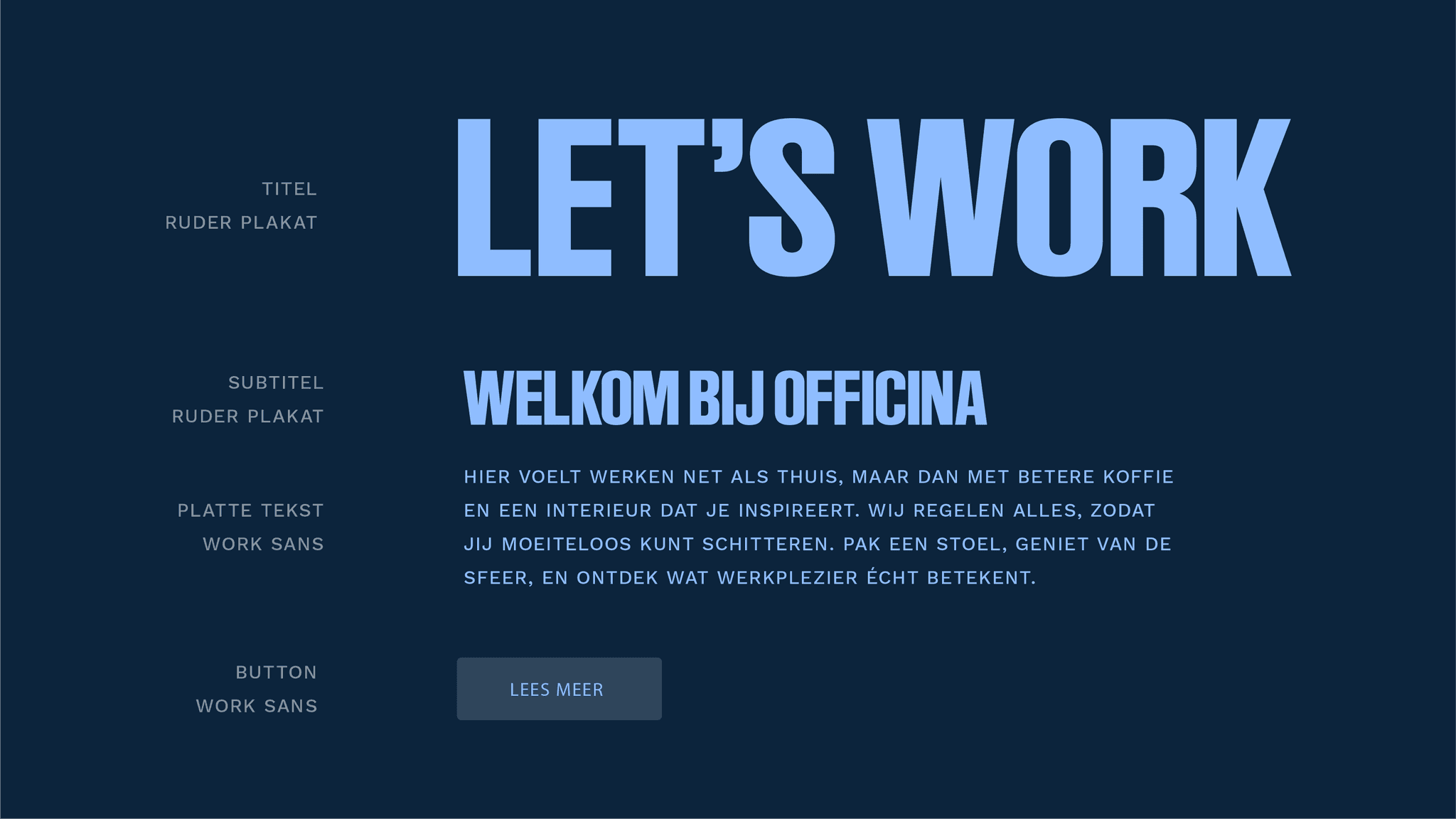Typografie is de stem van Officina, visueel en inhoudelijk. Goed gekozen lettertypes geven structuur, karakter en professionaliteit. Ze zorgen ervoor dat teksten lezen als een vanzelfsprekend onderdeel van de merkervaring. De typografie van Officina is krachtig, helder en eigentijds. De combinatie van Worker Sans en Ruder Plakat brengt een balans tussen toegankelijkheid en karakter.